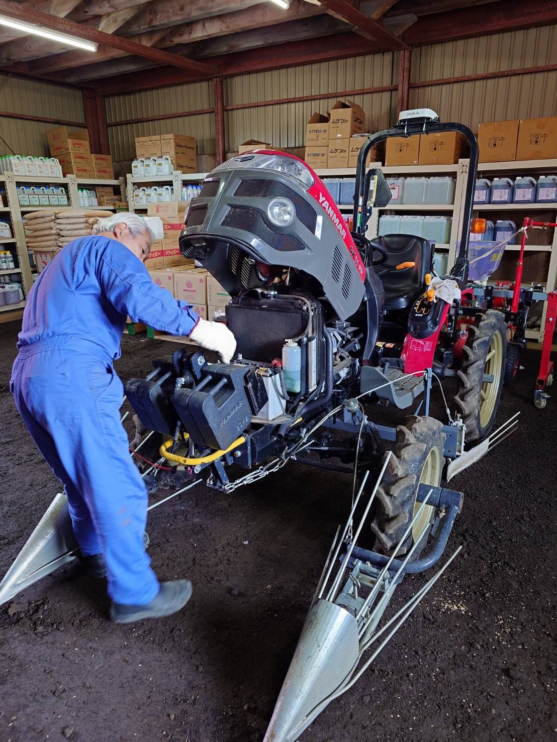 この不具合をいち早く察知する為に、播種作業時は、作業機の後ろに補助の人間に乗ってもらい、常時監視しています。